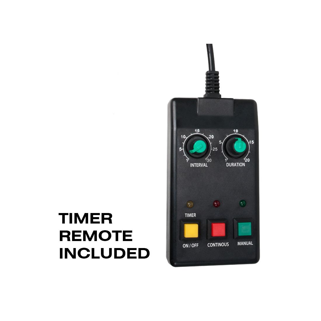 Easy cleanup is facilitated by the built-in water drainage system with a valve, plastic hose, and water collection bag. The fog fluid container is removable and easy to clean at the end of use. The included ADJ VFTR13 timer remote control offers various control options, making it a breeze to customize your fog output.