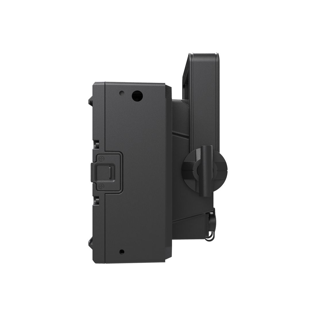 The rear panel includes IP65-rated 5-pin DMX In/Out and power locking In/Out connections, enabling seamless daisy chaining of power and data. Both the DMX and power ports are shielded with rubber protective covers. An intuitive OLED display with touch-sensitive buttons ensures easy access to the fixture's functions.