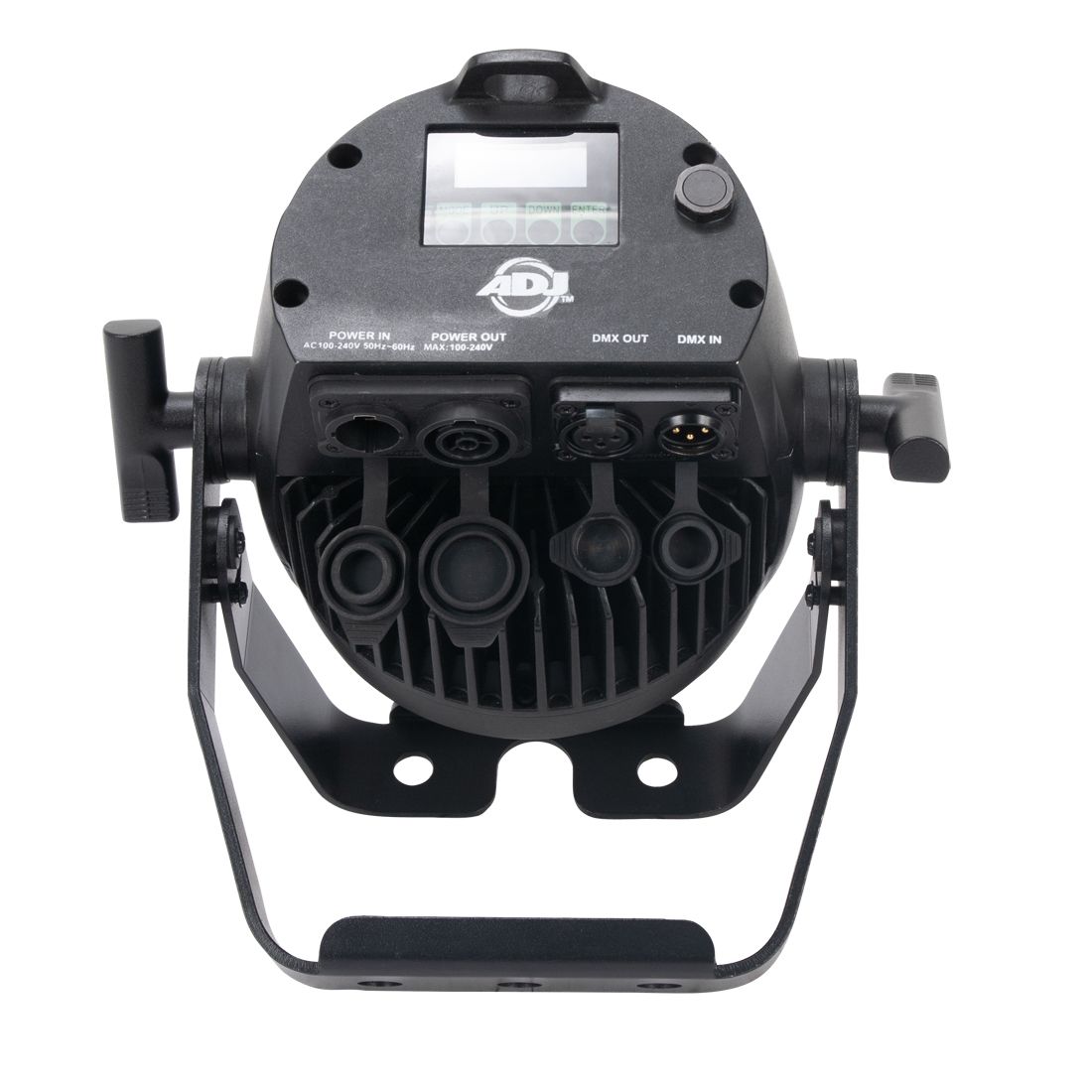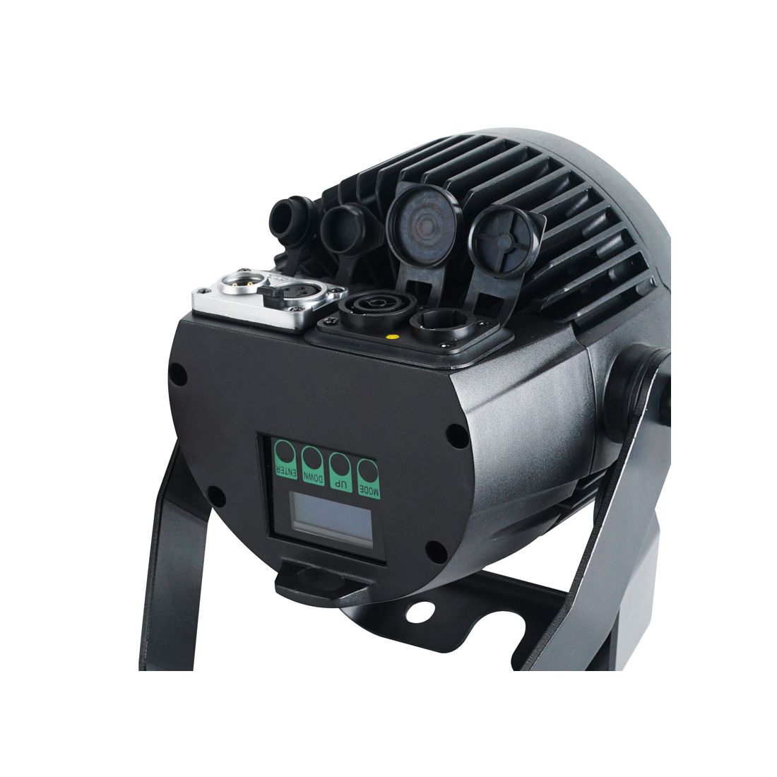 7P HEX IP professional features include: 4 DMX modes, 5 operational modes, 4 dim modes, flicker free operation and a 4-Button DMX menu with digital display. The unit is equipped with IP65 Locking Power and IP rated 3-pin DMX rubber covers and connectors.