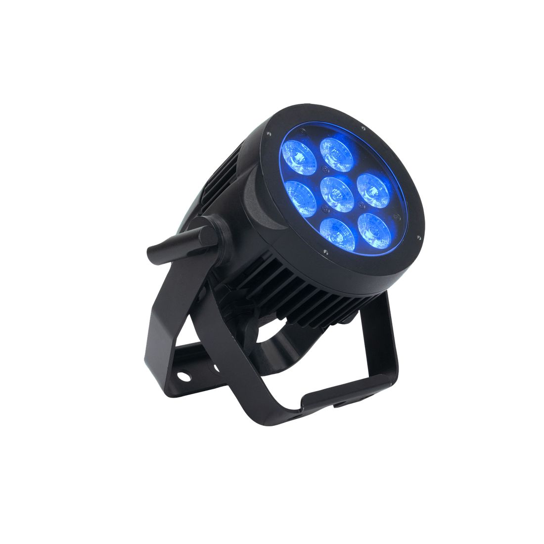 The ADJ 7P Hex IP is a versatile IP65 outdoor rated Par with 7 x 12-Watt (6-IN-1 HEX) LEDs. With a 25-degree beam angle, users may produce wide washes with smooth color mixing from 63 built-in color macros utilizing red, green, blue, amber, white and UV LEDs. Not only is this LED Par great for lighting indoor stages and venues, but with IP 65 rating, it is a great solution for temporary outdoor lighting of stages or events. The IP 65 rating helps protect the fixture from rain, snow and dust.