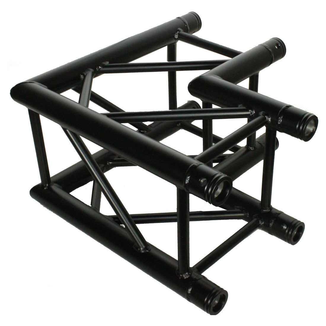 The DT34/3 Black System is a matt black (RAL 9005) powdercoated 4-point truss system that is connected with conical connectors, bolts and locking pins. This quick connector system closes force-lockingly with the belt tube and allows rapid construction during frequent assembly and dismantling. The main tubes are made of 50mm aluminum tube with a wall thickness of 3mm and give this system an outstanding strength-to-weight ratio. The struts have a diameter of 20 mm with a wall thickness of 2mm. Each truss piece includes all necessary conical connectors, steel pins and safety clips.