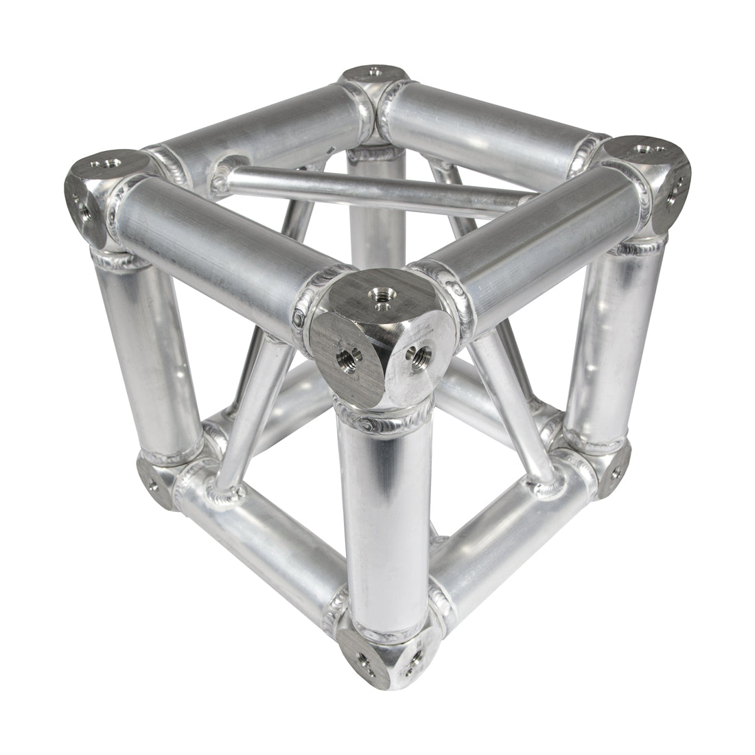 The DT34/3 System is a 4-point truss system that is connected with conical connectors, bolts and locking pins. This quick connector system closes force-lockingly with the belt tube and allows rapid construction during frequent assembly and dismantling. The main tubes are made of 50mm aluminum tube with a wall thickness of 3mm and give this system an outstanding strength-to-weight ratio. The struts have a diameter of 20 mm with a wall thickness of 2mm. Each truss piece includes all necessary conical connectors, steel pins and safety clips.