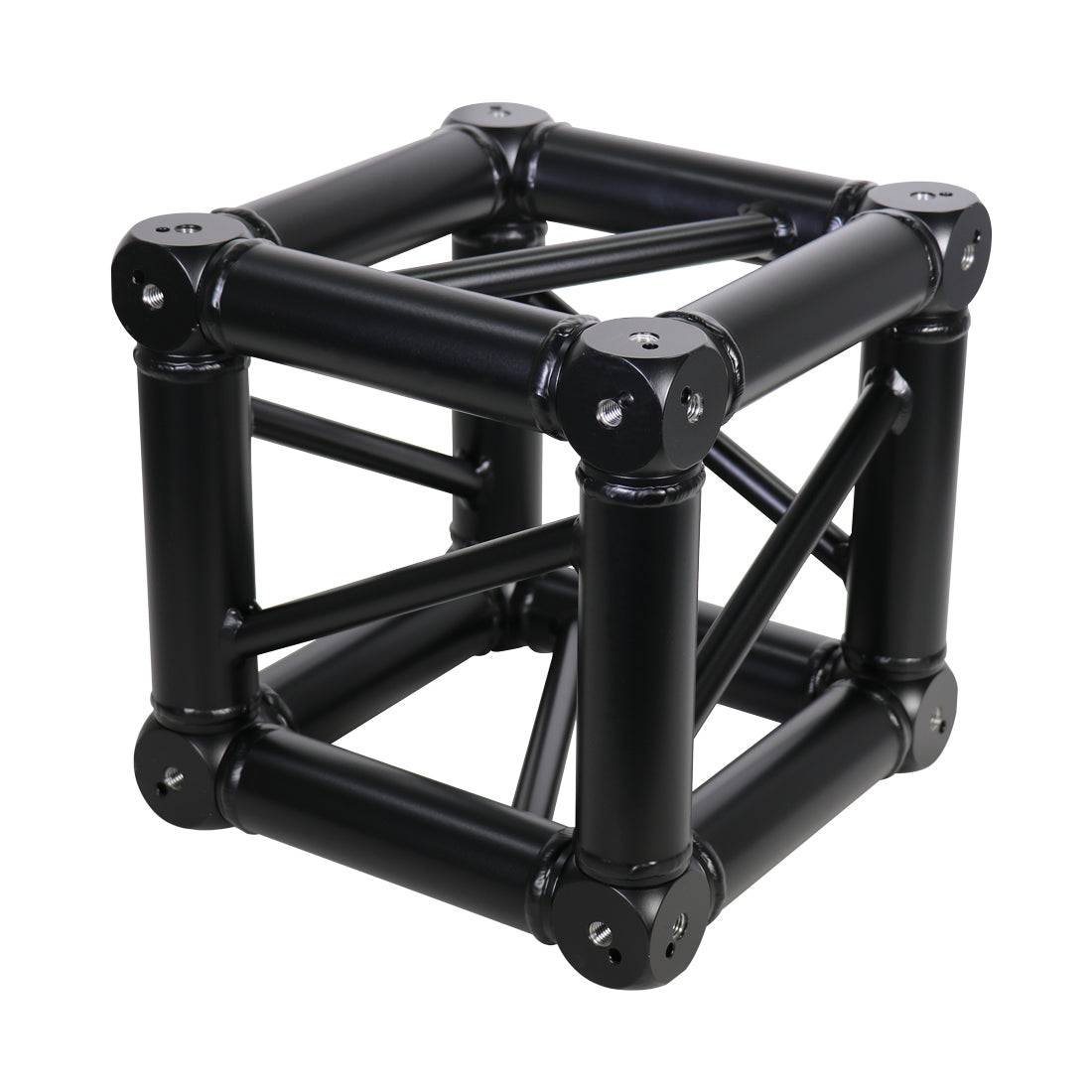 The DT34/2 Black System is a matt black (RAL 9005) powdercoated 4-point truss system that is connected with conical connectors, bolts and locking pins. This quick connector system closes force-lockingly with the belt tube and allows rapid construction during frequent assembly and dismantling. The main tubes are made of 50mm aluminum tube with a wall thickness of 2mm and give this system an outstanding strength-to-weight ratio. The struts have a diameter of 20 mm with a wall thickness of 2mm. Each truss piece includes all necessary conical connectors, steel pins and safety clips.
