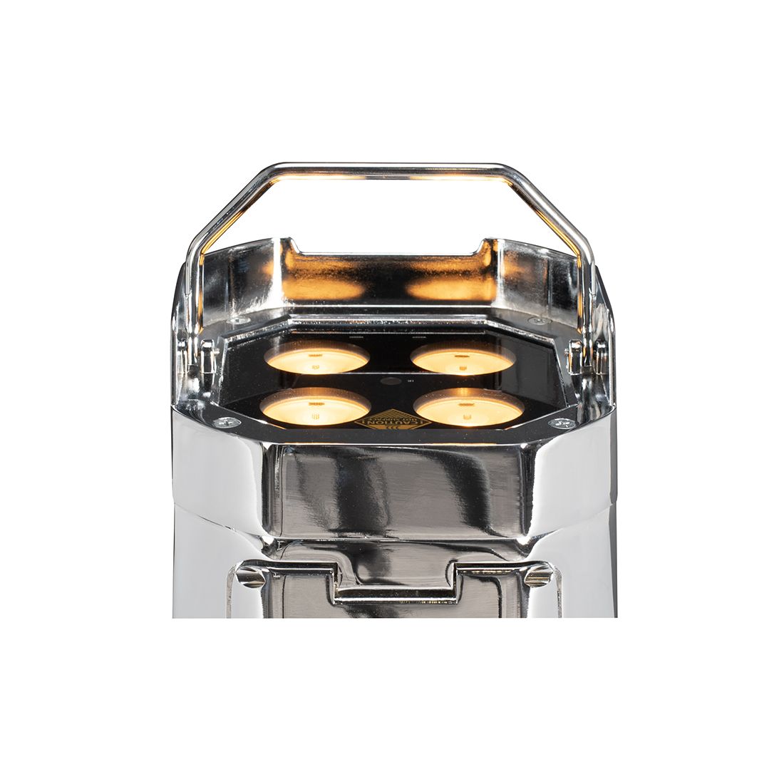 The ADJ Lighting Element H IP Chr is a high-performance, battery-powered, wireless DMX-controlled up lighting fixture with advanced features suitable for various events such as weddings, concerts, theaters, and more. Housed in a shiny black rugged metal casing, with four 20-Watt RGBAW+UV LEDs, it creates vibrant and dynamic lighting effects that can be controlled remotely through Wireless DMX. Its built-in Wireless communication protocol ensures a stable and secure connection, allowing you to control the lighting fixtures from up to 700m away.