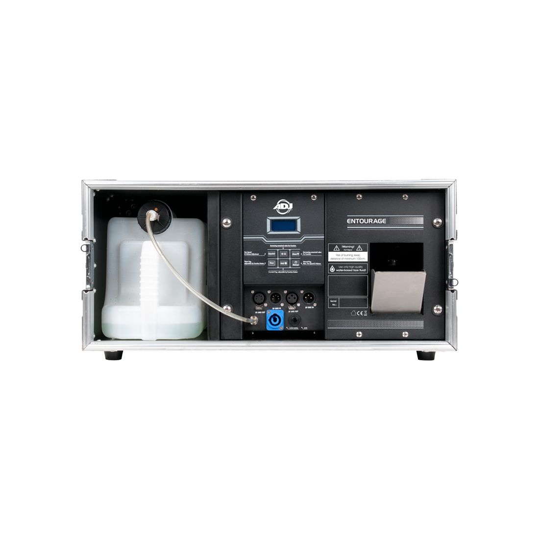 The ADJ Entourage is a professional grade touring Faze Machine built into a durable flight case. This pro Fazer offers a very quick warm-up time and produces a massive amount of atmosphere. The Entourage features an easy to read LED function display with fog timer, continuous fog and manual fog options. Connections include 3-pin and 5-pin DMX and Locking Power AC input. Uses high quality water based fog fluid.
