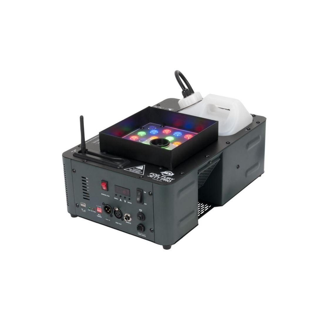 The ADJ Fog Fury Jett Pro is a high velocity vertical Fog Machine that mixes color into the fog from 28x 3-Watt LEDs (6 Red, 7 Green, 6 Blue, 3 Amber & 6 UV LEDs). The Fog Fury Jett Pro produces a dry even blast of fog over 40 feet (12 meters) in the air. It has a special heating element design that uses an oil type transmission throughout the pipeline to prevent clogging. It is also equipped with a high performance Italian pump system for optimum output. ADJ’s Electronic Thermo Sensing (ETS) technology is on-board to maintain optimum heat levels with short warm-up time between fog blasts.
